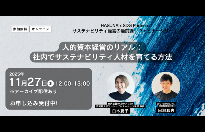 SDGパートナーズは ㈱HASNA と、11月27日(木)12時~13時に オンライン・ウェビナー「人的資本経営のリアル:社内でサステナビリティ人材を育てる方法」を共催します!