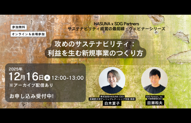 SDGパートナーズは ㈱HASNA と、12月16日(火)12時~13時に オンライン・ウェビナー「攻めのサステナビリティ:利益を生む新規事業のつくり方」をオンライン(Zoom)と会場参加のハイブリッドで共催します!