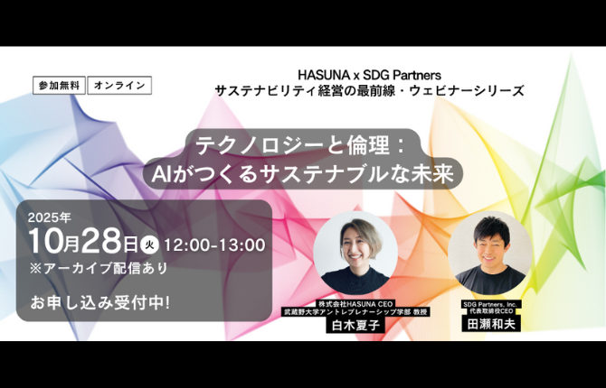 SDGパートナーズは ㈱HASNA と、10月28日(火)12時~13時に オンライン・ウェビナー「テクノロジーと倫理:AIがつくるサステナブルな未来」を共催します!