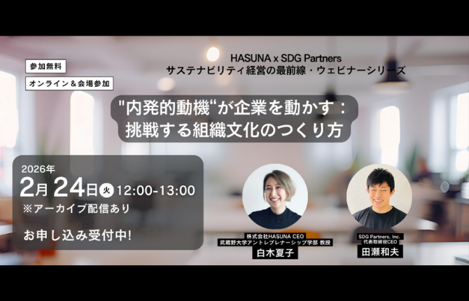 SDGパートナーズは ㈱HASNA と2月24日(火)12時~13時に オンライン・ウェビナー「内発的動機が企業を動かす:挑戦する組織文化のつくり方」を共催します。